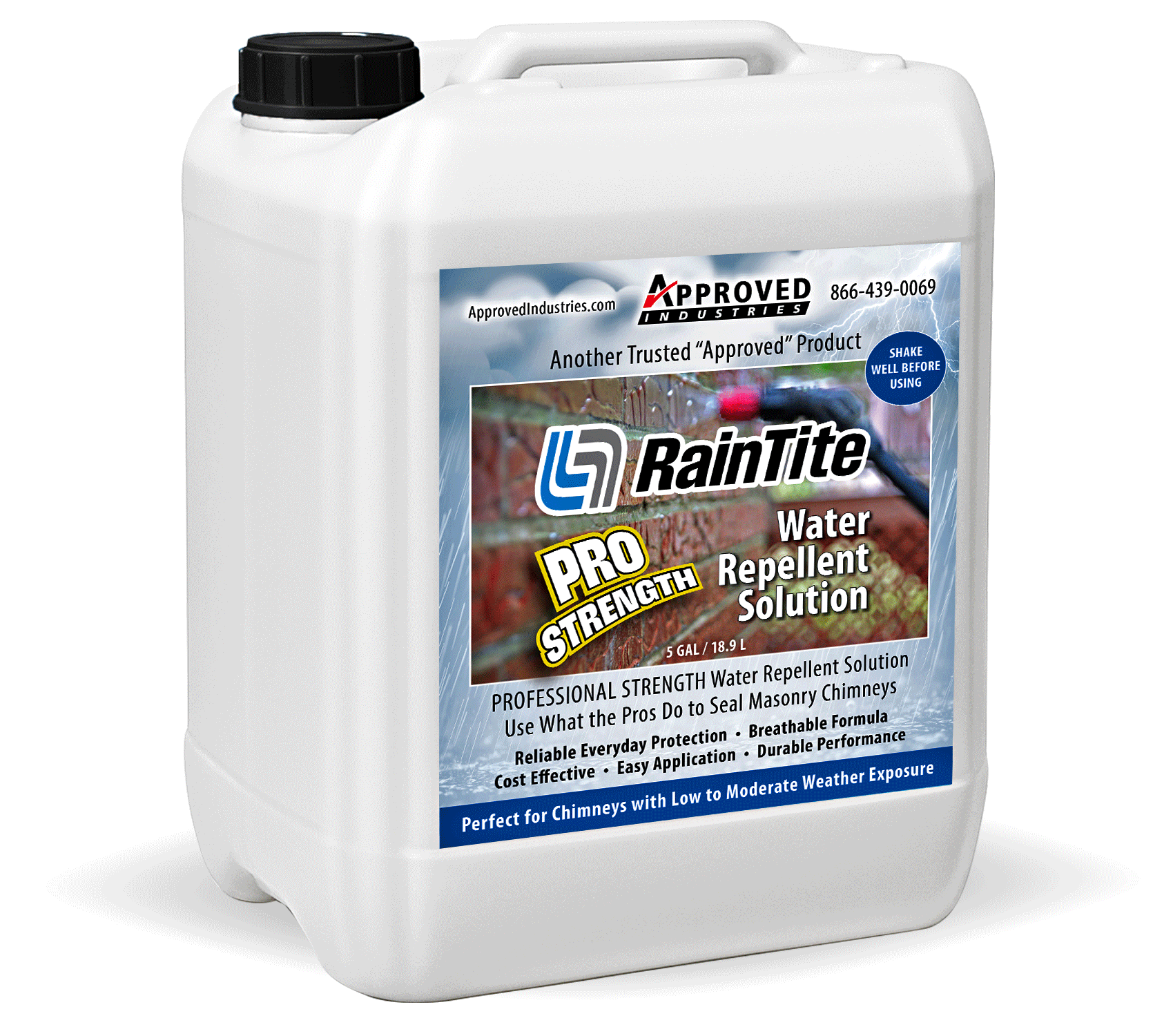 RainTite Pro is a water-based, breathable waterproofing solution designed to protect masonry chimneys from moderate weather exposure. This cost-effective product provides a durable barrier against moisture, preventing common issues such as efflorescence, staining, and minor cracking.